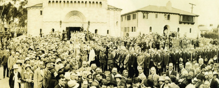 Monsignor Nicholas Conneally, was Fr. Hawe's successor as pastor and served until 1949. Soon after becoming pastor, Father Conneally moved his rectory to a house on Fourth Street near the original church. He then sold the original parish site and the old church was razed. Until the present church was completed in 1925, services were held at a former Protestant church at the corner of Arizona and Lincoln, the site of the present Santa Monica Boys Club. The new Saint Monica's, described as a cathedral in its time, was dedicated by Bishop John J. Cantwell on July 11, 1926. (Pictured above) Its cost was reported to be $340,000. The new rectory was built shortly afterward. Saint Monica experienced explosive growth during that time which included the addition of two schools. For those who are Bing Crosby fans, the movie Going My Way was based on some of Msgr. Conneally's anecdotes about his work in the parish and schools and was also filmed partly at St. Monica.
